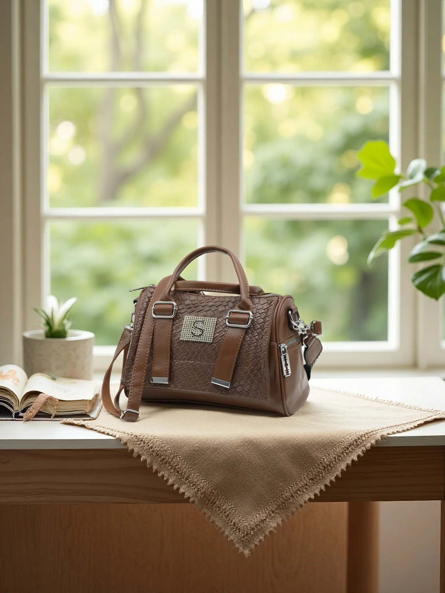 Add a touch of sophistication to your wardrobe with this cream white faux leather satchel handbag. Designed with a chic textured croc pattern and adorned with a sparkling rhinestone “S” emblem, this bag perfectly blends elegance and modern style. The silver-tone hardware and buckle strap details give it a polished, high-end look.